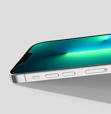 Angled smartphone with a transparent glass screen protector hovering above it, illustrating ultra-thin, clear screen protection.
